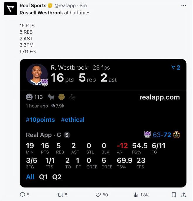 末节,威少已经完成20+10(篮板)的数据了,这也是他本赛季首次得分+篮板的两双,也是国王生涯连续第二场两双(职业生涯525次两双),上一场是得分+助攻的两双,末节威少4中3拿到6分4篮板1助攻1抢断真的竭尽全力了。