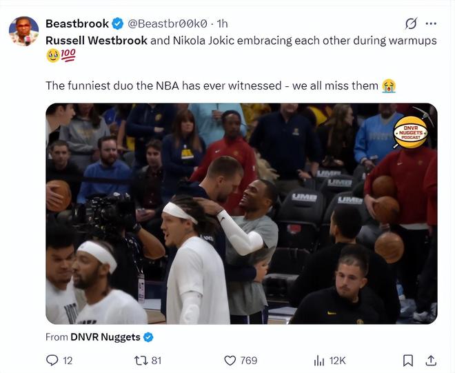这场比赛是威少作为国王球迷首次回到丹佛主场,约基奇赛前与威少相谈甚欢,两人是拥抱致意,说明约老师跟威少的感情很好。