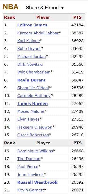 此役过后,威少在NBA历史得分榜上连续超越绿军两位名宿哈弗里切克和保罗-皮尔斯升至历史第18位。目前排在威少身前的是马刺传奇蒂姆-邓肯。