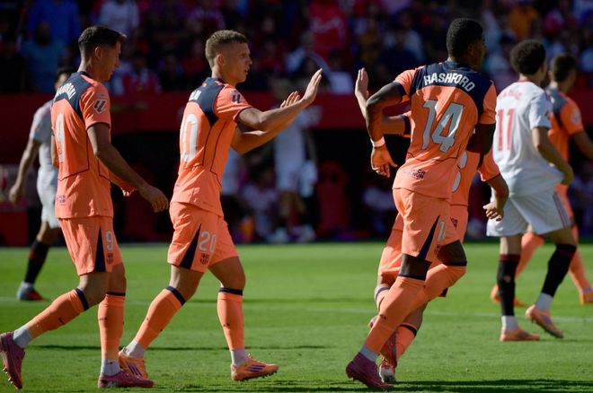 上周的欧冠,巴萨被大巴黎绝杀尝到了赛季首败,回到西甲赛场,巴萨不仅未能重返正轨,反而继续吃到败仗。开场第13分钟,阿劳霍便在禁区内撞倒了罗梅罗,从而让对手获得点球机会;36岁的桑切斯面对老东家主罚命中,巴萨早早落后。第37分钟,巴尔加斯左路助攻罗梅罗包抄推射扩大优势;拉什福德半场结束前接到佩德里的传中凌空斩打进个人西甲首球。